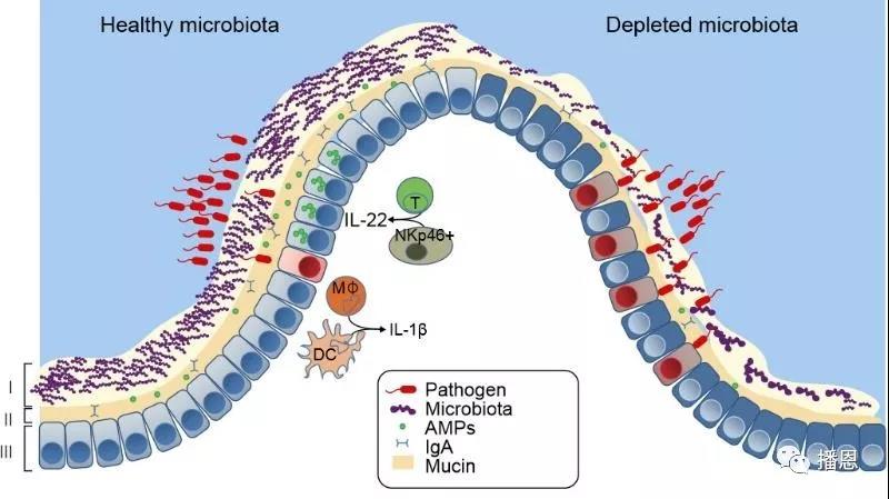 從下圖可以看出,左側的腸黏膜特點為存在致病微生物(Pathogen,紅色小蝌蚪狀),還存在豐富的益生菌(Microbiota,小螞蟻狀),只有很少的致病微生物進入粘蛋白層(Mucin,黃色部分),而且在粘蛋白層內存在豐富的抗菌肽(AMPS,紅色小圓點)和免疫球蛋白A(IgA),此外免疫細胞T細胞也已被激活。而右側,益生菌很少,這樣就無法誘導腸黏膜上皮細胞產(chǎn)生足夠的粘蛋白,薄的粘蛋白層起到的物理屏障就弱。