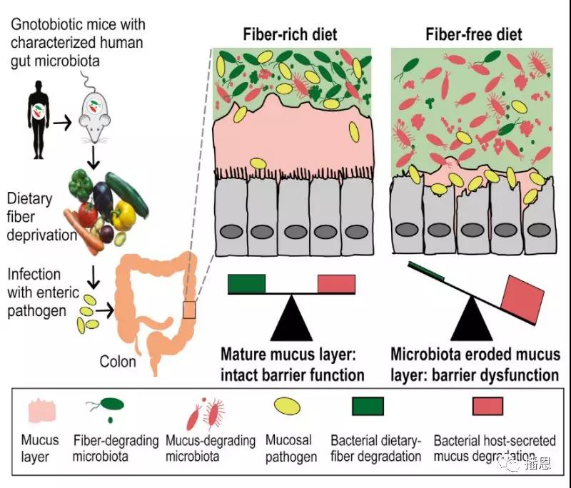 而飼喂大鼠缺乏膳食纖維的日糧(Fiber-freediet)時,腸道黏膜的粘蛋白含量很少,形成的“墻”很薄,此時腸黏膜的屏障能力很差,而且致病微生物也已經(jīng)開始侵蝕腸上皮細胞。因此,給“二師兄”補充膳食纖維也是一種行之有效的提高“二師兄”“內在修為”的途徑。