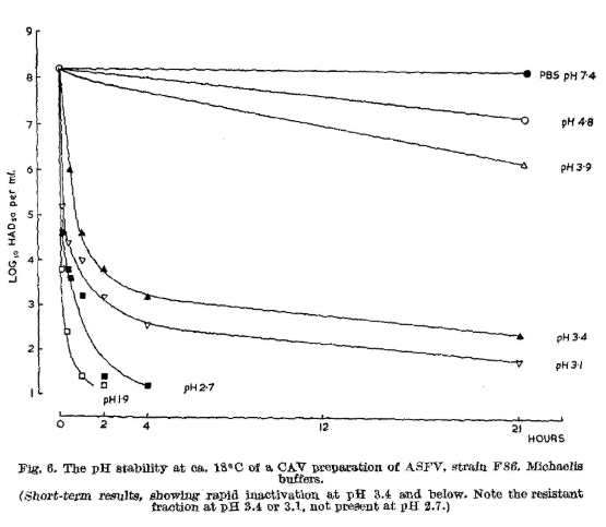 王博士答:可以,這里指的是飲水酸化。談到酸性物質(zhì)和非洲豬瘟,這里有一篇英國動(dòng)物病毒研究所的Plowright和Parker于在1967年發(fā)表的文章。這篇文章從加熱和pH對(duì)非洲豬瘟病毒穩(wěn)定的影響進(jìn)行了研究。請(qǐng)看這個(gè)圖,在pH7.4時(shí)非洲豬瘟病毒穩(wěn)定性沒有變化,而在pH4.8時(shí)非洲豬瘟病毒穩(wěn)定性開始下降。這篇論文給我們的啟示是:如果能夠降低豬的飼料(包括飲水)的pH,就可以“破壞”非洲豬瘟病毒。我們的四驅(qū)雙酸發(fā)酵料的pH在4.5以下,再輔以酸化的飲水(pH4.0),再加上胃酸的作用,[AW1] 對(duì)可能存在的非洲豬瘟病毒就會(huì)造成毀滅性打擊。