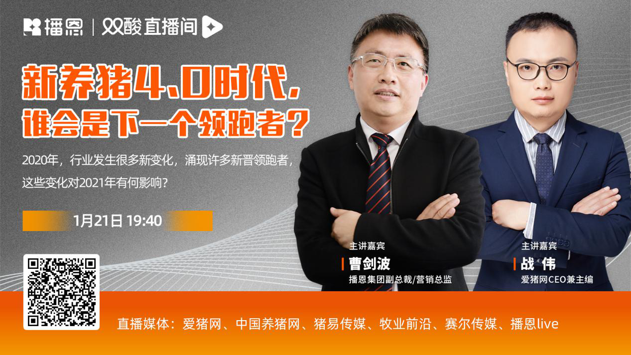 121晚19:40,播恩雙酸直播間2021開年直播如期而至,這期的主題是——“養(yǎng)豬新4.0時代,誰會是下一個領(lǐng)跑者”。此次直播,特別邀請了播恩集團副總裁/營銷總監(jiān)曹劍波與愛豬網(wǎng)CEO/主編戰(zhàn)偉兩位行業(yè)大咖做客直播間,以訪談式直播為方式,交流農(nóng)牧話題。兩位嘉賓從2020年行業(yè)現(xiàn)象著手,高度凝練2020的挑戰(zhàn)與收獲,進而思考2021年豬業(yè)趨勢……攜農(nóng)牧朋友告別2020,共同迎接2021年辛丑金牛年。
