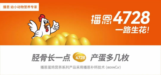 播恩4728,一路生花。為解決蛋雞養(yǎng)殖的營養(yǎng)痛點,提供更專業(yè)細致的飼料營養(yǎng)呵護,播恩對產(chǎn)品創(chuàng)新迭代升級,并全新推出4728蛋雞營養(yǎng)系列新品。該系列產(chǎn)品均采用播恩補鈣技術(shù),完美解決鈣消化、鈣吸收和鈣沉積三大命題,已申請專利保護。新品覆蓋了蛋雞育雛、育成、產(chǎn)蛋和淘雞4個時期的7個核心營養(yǎng)產(chǎn)品:開口料H000、育雛料H041、育成料H042、產(chǎn)蛋料H353/H033,伴產(chǎn)寶、伴殼寶、伴淘寶。具有更強的產(chǎn)品力及競爭優(yōu)勢,有效滿足專業(yè)化蛋雞養(yǎng)殖營養(yǎng)需求。