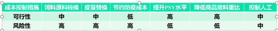 從降本措施來(lái)說(shuō),各項(xiàng)活動(dòng)的可行性和風(fēng)險(xiǎn)性都是并存的,如在進(jìn)行飼料原料的更換時(shí),可能會(huì)降低成本,但是也可能會(huì)引起豬的應(yīng)激反應(yīng)。