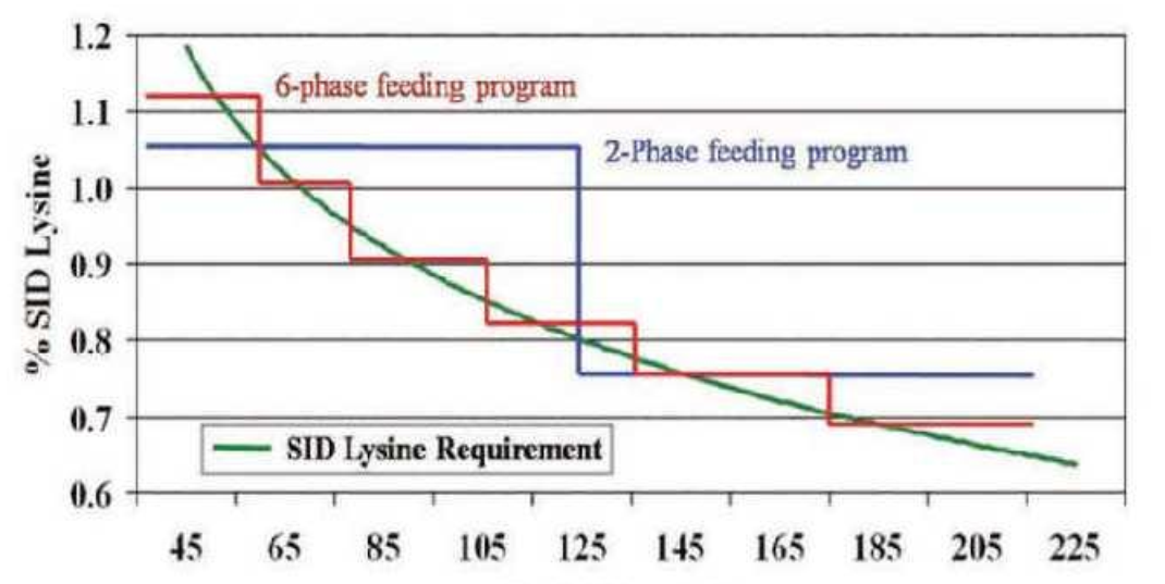 圖1展示的是商品豬從保育到育肥出欄,分兩階段飼喂和六階段飼喂的差異。兩種配方飼喂,方法雖然操作簡單,但會造成飼料隱性浪費(fèi)??紤]到前期豬群體重小采食量低,飼料營養(yǎng)濃度一般較高,導(dǎo)致豬在生長過程中大多數(shù)時間處于營養(yǎng)過剩階段,營養(yǎng)物質(zhì)不能充分利用,多余的營養(yǎng)素増加了豬的代謝負(fù)擔(dān),且會隨糞便排出體外,造成飼料成本增加。過剰的營養(yǎng)還會增加糞便排放量,增加糞污處理難度。而多階段料飼喂則是比較精細(xì)化的飼喂方式,可保證豬群大多階段營養(yǎng)物質(zhì)的攝入正好可滿足自身的需要,依靠這種飼喂方法可滿足豬群的實際氨基酸需要,實現(xiàn)精準(zhǔn)飼喂及有效降低生產(chǎn)成本。在設(shè)計多階段日糧飼喂方案時可通過原料及營養(yǎng)指標(biāo)梯度設(shè)計來減少換料應(yīng)激。