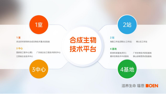 播恩集團構建了“1室2站3中心4基地”的技術創(chuàng)新與服務平臺,即農業(yè)農村部飼料合成生物技術重點實驗室,海智工作站(原院士工作站)、博士后工作站,國家級工程中心(籌)、廣東省企業(yè)工程技術研究中心、江西省企業(yè)技術中心,歐洲科研基地(荷蘭)、廣州生物技術研發(fā)基地、贛州生物技術中試基地、佛山動物營養(yǎng)試驗基地。依托這一平臺,播恩成功研發(fā)出以OEN效能營養(yǎng)為代表的核心技術,在動物營養(yǎng)技術創(chuàng)新領域持續(xù)領跑。